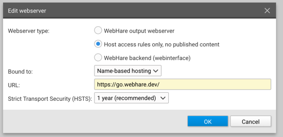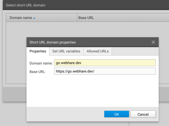 - Set up an extra host name for the short links, eg 'go.webhare.dev'. Ensure it's setup properly in the DNS.